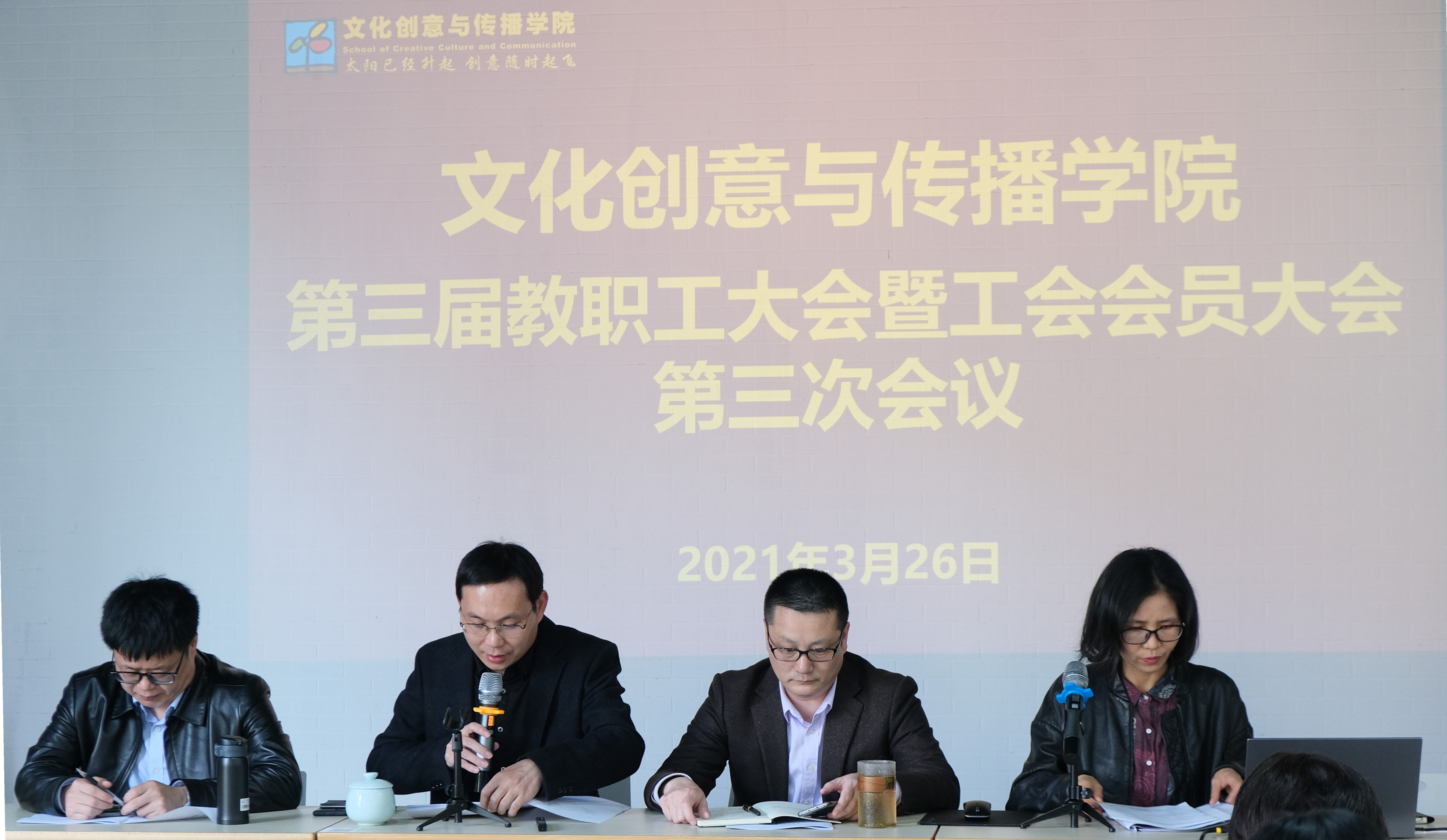 3月26日,文化创意与传播学院第三届教职工大会暨工会会员大会第三次会议在学院28幢3楼会议室举行。会议听取、审议了院长工作报告,审议通过了《文化创意与传播学院“十四五”发展规划(讨论稿)》《工会工作报告(书面)》。院党委副书记金坚真主持会议。