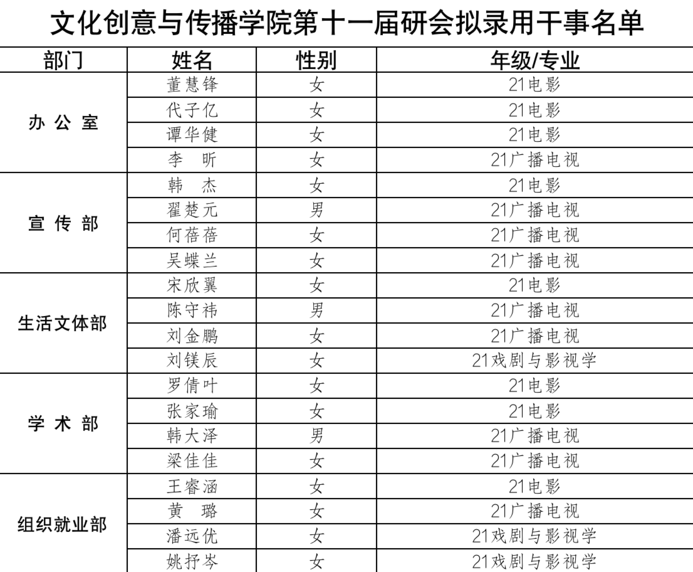 经过前期同学自主报名,第十一届研究生会全委会组织面试,学院考察和审核,现确定我院第十一届研究生会拟录用干事名单,具体名单如下: