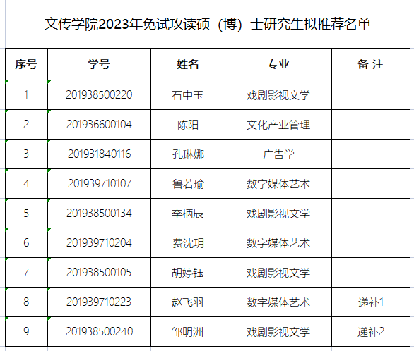 根据学校2023年优秀应届本科毕业生免试攻读硕士学位研究生推荐办法的规定,经学生自主申请,学院专家审核小组审核申报材料,学院推免工作小组遴选,现将拟推荐名单及排序予以公示,公示期为2022年9月16日-9月18日,凡对公示内容有异议者,请9月18日17点之前据实以书面形式提交学院教务办,也可投入教务办门口的意见箱或邮箱:yt@zjnu.cn。
