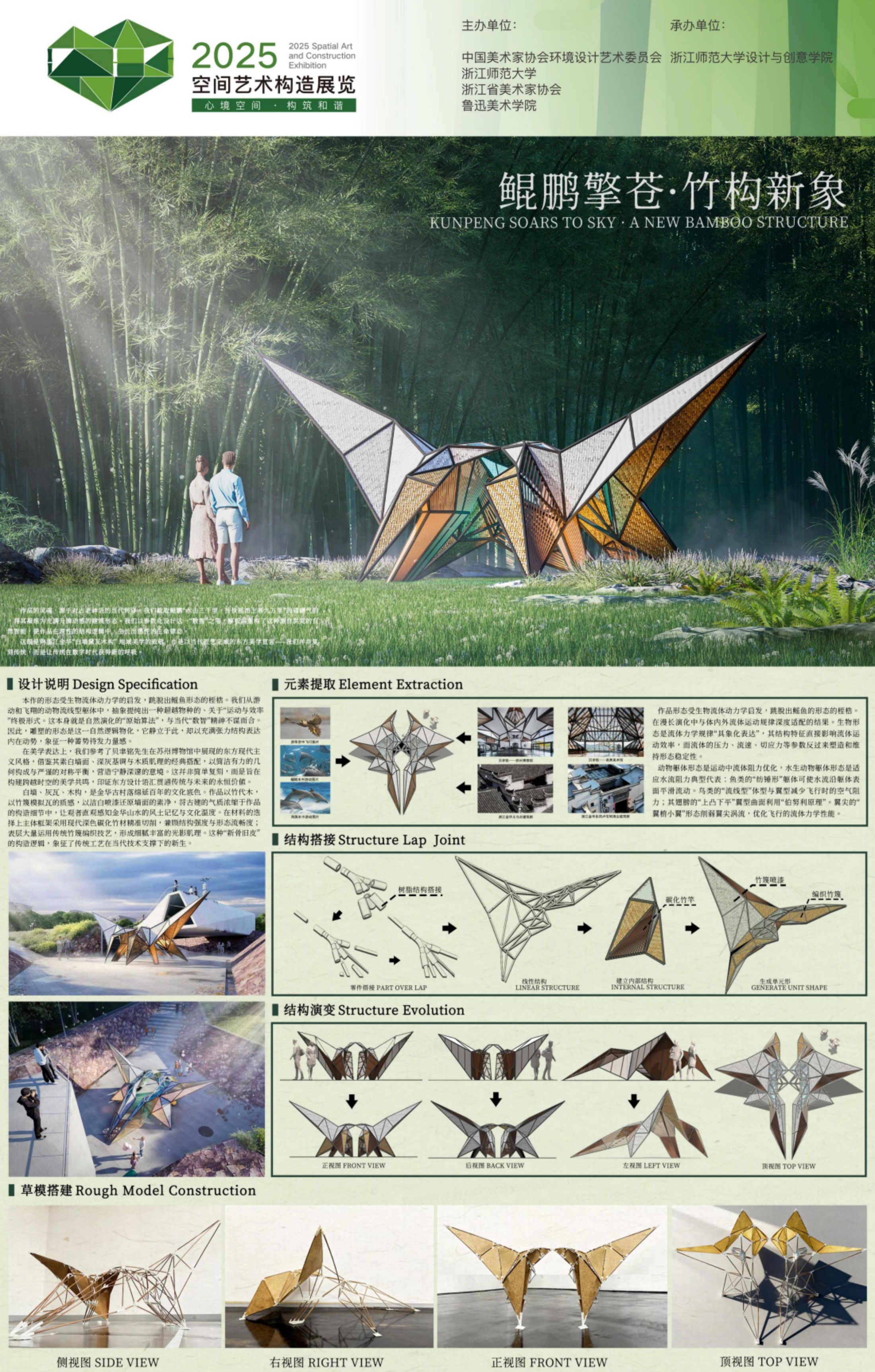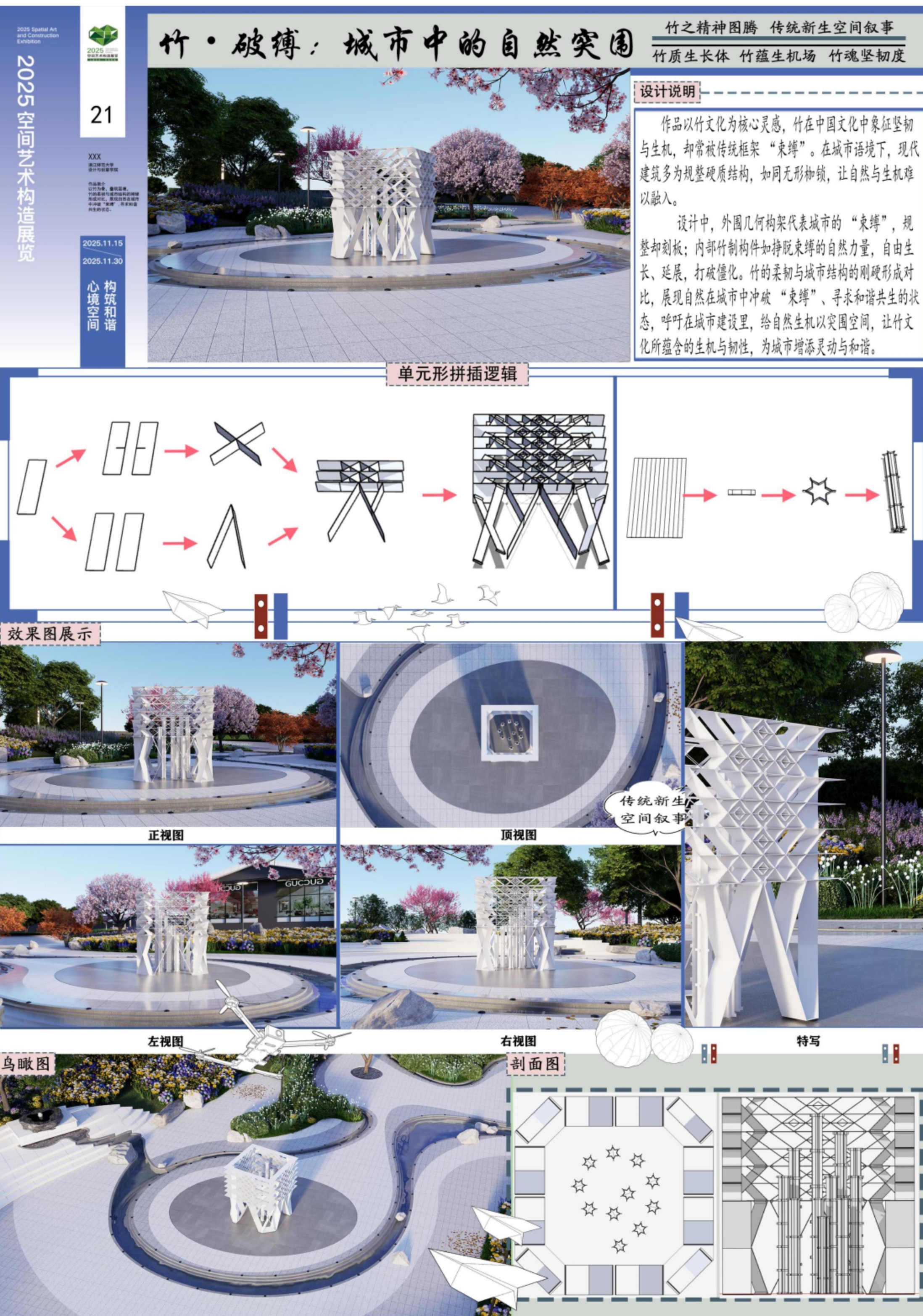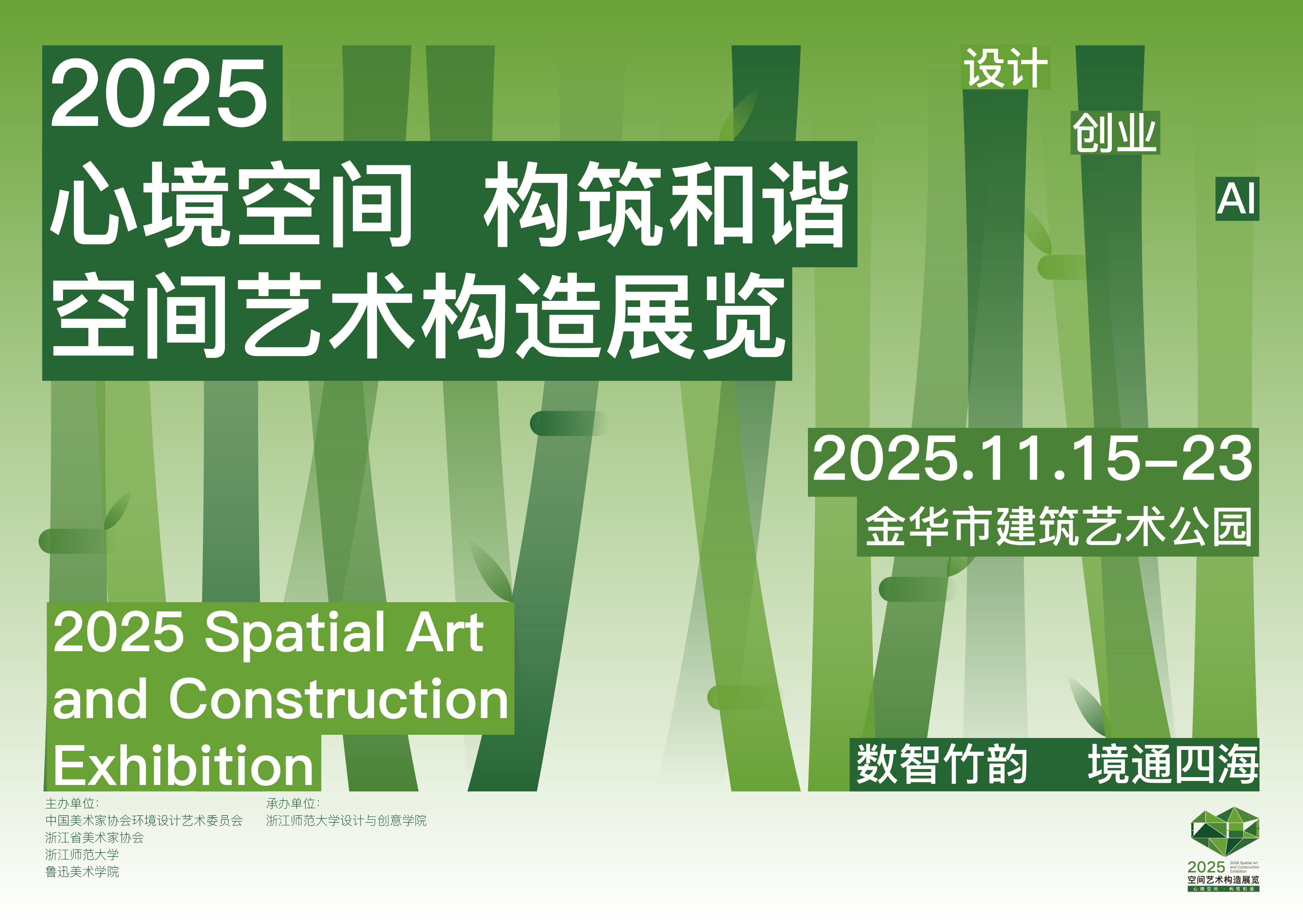 2025年是“十四五”规划收官与“十五五”规划开局的关键之年。本次展览积极响应党的二十大报告关于教育、科技、人才“三位一体”发展的战略部署,旨在通过AI与数字化技术赋能艺术设计,推动教育数字化转型,培养大学生创新思维与创新创业能力。展览以“数智竹韵,境通四海”为主题,探索环境艺术、空间艺术、公共艺术等多种艺术形式与科学的深度融合,强化艺术人才综合素养,推动创新体系优化整合。