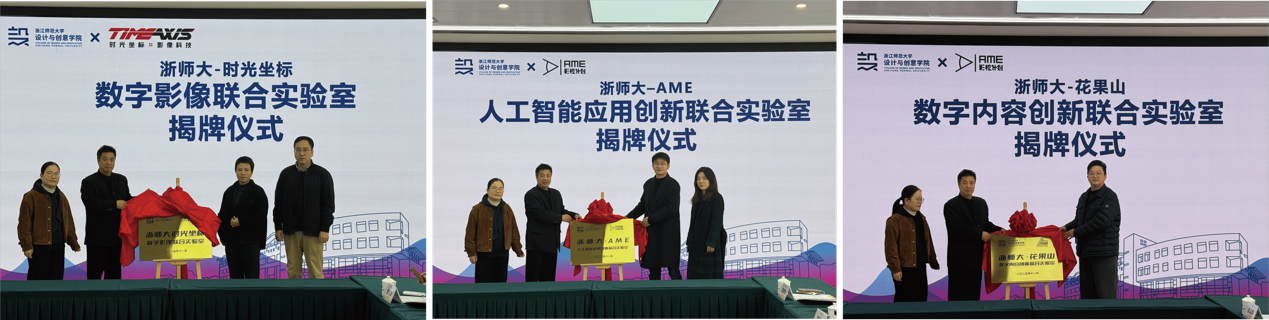 揭牌环节,校教务处副处长赵蝶玲、学院院长郑军德分别与三家企业代表共同为“浙师大-时光坐标 数字影像联合实验室”“浙师大–AME 人工智能应用创新联合实验室”“浙师大-花果山 数字内容创新联合实验室”揭牌,标志着学院校企合作迈入实质性推进阶段。
