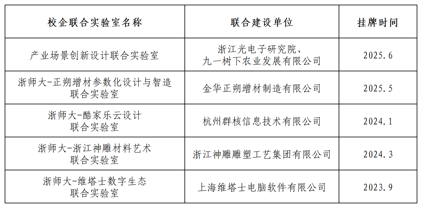 此后,围绕学院创新型、应用型人才培养定位,积极探索“校企联合实验室”模式,致力于整合校企资源,共建共享,赋能人才培养。截至2025年8月,学院先后建成了“浙师大-维塔士数字生态联合实验室”“浙师大-浙江神雕材料艺术联合实验室”“浙师大-酷家乐云设计联合实验室”“浙师大-正朔增材参数化设计与智造联合实验室”“产业场景创新设计联合实验室”5个 校企联合实验室。 学院未来将继续推进校企联合实验室建设,完善合作机制,拓展合作内容,链接更多优质企业资源。